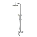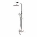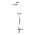 Устройство: душевая система • Смеситель: термостатический • Ручная лейка: размер 110 мм, настройки 3 шт • Верхний душ: размер 220 мм, настройки 1 шт • Комплектация: ручной душ, смеситель, стойка, шланг, крепление ручного душа