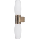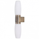 Светильник на штанге стиля модерн для ванной имеет размеры 420x80x110 мм. Арматура светильника окрашена в бронзовый цвет. Лампы в комплекте - отсутствуют. В светильнике применяются лампы накаливания или светодиодная LED-лампа. Цвет плафонов - белый, с матовой поверхностью. Материал плафонов - стекло. Класс электробезопасности - I, степень пылевлагозащиты (IP) - 44. Максимальная мощность лампы (Вт) - 40. Светильник размещается на стене.