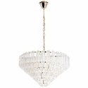 Подвесной светильник стиля модерн для гостиной, кабинета, прихожей или спальни имеет размеры 570x350 мм. Арматура светильника окрашена в золотой цвет. Лампы в комплекте - отсутствуют. В светильнике применяются лампы накаливания или светодиодная LED-лампа. Цвет плафонов - неокрашенный, с прозрачной поверхностью. Материал плафонов - хрусталь. Класс электробезопасности - I, степень пылевлагозащиты (IP) - 20. Максимальная мощность лампы (Вт) - 40. Светильник размещается на потолоке.