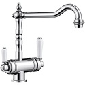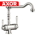 Классический дизайн элементов управления, подключение фильтра Отдельные рычаги управления для фильтрованной и нефильтрованной воды Один совмещенный излив для питьевой и обычной воды с разделением рассекателя