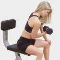 Скамья-стул с вертикальной спинкой. Технические характеристики: Прочная устойчивая конструкция обеспечивает стабильность при выполнении упражнений с гантелями и штангой. Сверхплотная подушка DuraFirm™ c двойным швом создает должный комфорт тренировки.