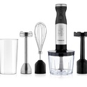 Тип: погружной (ручной) блендер • Скорости: плавная регулировка, импульсный • Насадки: ножка, венчики, нож для измельчителя • Дополнительно: для пюре