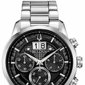 Мужской кварцевый хронограф. Центральные часовая и минутная стрелки, секундная стрелка вынесена на малый циферблат. Секундомер. Большая дата в позиции 12 часов. Черный циферблат. Корпус выполнен из полированной нержавеющей стали. Диаметр корпуса составляет 44 мм, толщина 13 мм. Стальной браслет, раскладывающаяся застежка. Прочное минеральное стекло устойчивое к мелким механическим повреждениям. Водостойкость WR 30 (брызги).