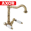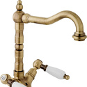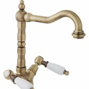 Назначение: для умывальника • Конструкция: двухрычажный • Монтаж: горизонтальный • Материал: латунь, покрытие - бронза • Подводка: гибкая • Монтажные отверстия: 1 отверстие • Форма излива: традиционная • Душевая лейка в комплекте: нет • Аэратор: есть • Донный клапан в комплекте: есть