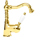 Назначение: для биде • Конструкция: однорычажный • Монтаж: горизонтальный • Клапан: керамический • Материал: латунь, покрытие - золото • Подводка: гибкая • Монтажные отверстия: 1 отверстие • Форма излива: традиционная • Душевая лейка в комплекте: нет • Аэратор: есть • Донный клапан в комплекте: есть