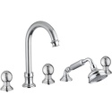Назначение: ванна+душ • Конструкция: двухрычажный • Монтаж: горизонтальный • Клапан: керамический • Материал: латунь, покрытие - золото • Подводка: гибкая • Монтажные отверстия: 5 отверстий • Форма излива: традиционная • Душевая лейка в комплекте: есть • Аэратор: есть