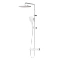 Устройство: душевая система • Смеситель: термостатический • Ручной душ (душевая лейка): размер 120 мм, настройки 3 шт • Верхний душ (тропический): размер 220 мм, настройки 1 шт • Комплектация: ручной душ, верхний душ, смеситель, стойка, шланг, крепление ручного душа
