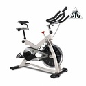 Вертикальный механический спин-байк с ременным типом привода и колодочной системой нагружения. Изменение нагрузки с помощью удобной рукоятки на корпусе тренажера. Предусмотрен экстренный тормоз. Спортивное сидение регулируется в вертикальной и горизонтальной плоскости, и позволяют подобрать удобную посадку для тренировки. Питание компьютера от батареек (тип ААА, 2 шт). На раме установлен держатель для бутылки. Для перемещения тренажера в помещении установлены колеса.