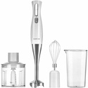 Тип: погружной • Мощность: 400 Вт • Управление: механическое • Количество скоростей: 2 скорости • Венчик для взбивания: есть • Измельчитель: есть, 0.5 л • Материал погружной части: пластик • Материал корпуса: пластик • Мерный стакан в комплекте: есть