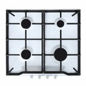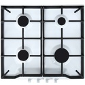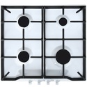 Поверхность: варочная панель • Тип поверхности: газовая • Рабочая поверхность: эмаль • Число конфорок: 4 • Установка: независимая • Газ-контроль конфорок: есть • Тип управления: механическое • Переключатели: поворотные • Электроподжиг: есть, автоматический • Размеры: 590x520x94 мм • Размер ниши для встраивания: 560x500 мм • Цвет: панель - белый