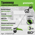Производитель: Greenworks Модель: GD60LT 2108307UB - Двигатель: электрический (аккумулятор) - Аккумулятор: 60 В, 4 Ач - Покос: ширина 40.6 см, леска 2.4 мм Описание