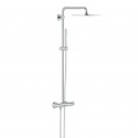 Устройство: душевая система • Смеситель: термостатический • Ручная лейка: размер 110 мм, настройки 3 шт • Верхний душ: размер 260 мм, настройки 3 шт • Комплектация: ручной душ, смеситель, стойка, шланг, крепление ручного душа