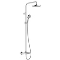 Устройство: душевая система • Смеситель: термостатический • Ручной душ (душевая лейка): размер 108 мм, настройки 2 шт • Верхний душ (тропический): размер 205 мм, настройки 1 шт • Комплектация: ручной душ, верхний душ, смеситель, стойка, шланг, крепление ручного душа