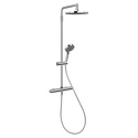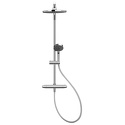 Устройство: душевая система • Смеситель: термостатический • Ручная лейка: размер 100 мм, настройки 3 шт • Верхний душ: размер 200 мм, настройки 1 шт • Комплектация: ручной душ, смеситель, стойка, шланг, крепление ручного душа
