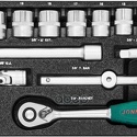 Комплектация- Головки торцевые, 13 шт.: 6, 7, 8, 9, 10, 11, 12, 13, 14, 17, 19, 21, 23 мм.;- Свечная головка 21 мм.;- Рукоятка трещоточная, 185 мм. ;- Удлинители, 2 шт.: 75 и 150 мм.;- Вороток шарнирный, 200 мм.;- Вороток Т-образный, 200 мм.;- Шарнир карданный.