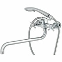 Назначение: универсальный • Конструкция: с раздельными клапанами • Монтаж: вертикальный • Клапан: керамический • Материал: покрытие - хром • Монтажные отверстия: 2 отверстия • Форма излива: традиционная • Душевая лейка в комплекте: есть • Держатель для душевой лейки: на смесителе • Донный клапан в комплекте: есть