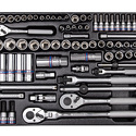 Комплектация- Головка торцевая стандартная шестигранная 1/4", KING TONY серии 2335M: 4, 4.5, 5, 5.5, 6, 7, 8, 9, 10, 11, 12, 13- Головка торцевая стандартная шестигранная 1/4", дюймовая KING TONY серии 2335S: 1/4, 3/8, 1/2- Головка торцевая глубокая шестигранная 3/8", KING TONY серии 3235M: 8, 10, 12, 14, 17- Головка торцевая стандартная шестигранная 3/8", KING TONY серии 3335M: 6, 7, 8, 9, 10, 11, 12, 13, 14, 15, 16, 17, 18, 19, 21, 22- Головка торцевая TORX Е-стандарт 1/4", L = 24 мм KING TONY серии 2375M: E4, E5, E6, E7, E8- Головка торцевая TORX Е-стандарт 3/8", L = 28 мм KING TONY серии 3375M: E10, E12, E14, E16, E18- Насадка (бита) торцевая 3/8", TORX, L = 50 мм KING TONY серии 3027M: T40, T45, T50- Насадка (бита) торцевая 1/4", TORX, L = 37 мм KING TONY серии 2037M: T10, T15, T20, T25, T27, T30- Насадка (бита) торцевая 1/4", TORX, L = 37 мм KING TONY серии 2033M: T20, T25, T30, T40- Головка свечная шестигранная 1/2", L = 70 мм, резиновый фиксатор KING TONY серии 4635R: 16, 21- Кардан KING TONY: 1/4, 3/8- Трещотка 1/4", 140 мм, 24 зубца, флажковая, фиксатор KING TONY 2769-55F- Трещотка 3/8", 200 мм, 32 зубца, флажковая KING TONY 3769-08F- Трещотка с шарниром 3/8" 290 мм KINGTONY 3789-11F- Вороток 1/4", 115 мм, скользящий KING TONY 2571-45- Вороток 3/8", 200 мм, скользящий KING TONY 3571-08- Вороток 1/4", 125 мм, с шарниром KING TONY 2452-05F- Вороток 3/8", 250 мм, с шарниром KING TONY 3452-10F- Удлинитель 1/4", KING TONY серии 2221: 50, 100- Удлинитель 3/8", KING TONY серии 3221: 40, 75, 150.- Ложемент