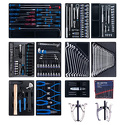 КомплектацияМодуль 1Набор торцевых головок 1/2" с принадлежностями 9-4333MR03 33Набор торцевых головок 3/8" с принадлежностями 9-3523MR 23Модуль 2Набор ударных головок 1/2" и торцевых головок 1/4" с принадлежностями 9-7540MR 40Набор торцевых насадок, шестигранники Г-образные и разрезные ключи 9-90131MR 31Модуль 3Набор комбинированных ключей 9-1216MR03 16Набор накидных ключей 9-1711MR 11Модуль 4Набор отверток, съемник клипс и гибкий магнит 9-31919MR 19Модуль 5Набор съемников стопорных колец, пассатижей и бокорезов 9-40207GP 7Набор переставные клещи, разводной ключ и молоток 9-90103PP02 3Модуль 6Набор отвертка ударная 5/16" с принадлежностями 9-4128FR 10Набор выколоток, бородков, кернеров 1010PR 10Съемник подшипников 3-х захватный 100 мм 7963-04 1Съемник подшипников 2-х захватный 100 мм 7962-04 1Технические характеристикиМатериалы – инструментальные стали Cr-V, Cr-Mo, SNCM+V (S2), конструкционная сталь, хром, пластики PP, вспененный PVC, PP+TPR (рукояти отверток, трещоток, шарнирно-губцевого инструмента), дерево (рукоять молотка), PVC (ложемент)Размеры упаковки – 575 × 540 × 420 ммВес – 31,7 кг