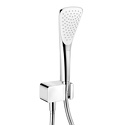 душевая лейка KLUDI FIZZ 1S DN 15 бодрящая струя система быстрой очистки от известковых отложений расход воды 19 л/мин при давлении 3 бара шланг KLUDI SUPARAFLEX SILVER/WHITE с двусторонней защитой от скручивания G 1/2 x G 1/2 x 1250 мм соединение для шланга с настенным держателем для душа DN 15 клапан защиты от обратного потока с крепежным набором отвод для душа G 1/2 с коническими гайками