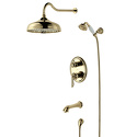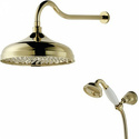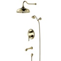 Устройство: душевая система • Смеситель: джойстик • Ручная лейка: размер 66 мм, настройки 1 шт • Верхний душ: размер 303 мм, настройки 1 шт • Комплектация: ручной душ, смеситель, шланг, крепление ручного душа • Покрытие: под золото