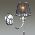 Бра стиля модерн для гостиной, кабинета или спальни имеет размеры 150x290x250 мм. Арматура светильника окрашена в хромовый цвет. Лампы в комплекте - отсутствуют. В светильнике применяются лампы накаливания или светодиодная LED-лампа. Цвет плафонов - неокрашенный, черный, с прозрачной поверхностью. Материал плафонов - органза, хрусталь. Класс электробезопасности - I, степень пылевлагозащиты (IP) - 20. Максимальная мощность лампы (Вт) - 40. Светильник размещается на стене.