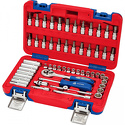 Комплектация– Головки и принадлежности 1/4"Головки торцевые стандартные 6-гранные – 4, 4.5, 5, 5.5, 6, 7, 8, 9, 10, 11, 12, 13, 14 ммГоловки торцевые глубокие 6-гранные – 6, 7, 8, 9, 10, 11, 12, 13 ммГоловки торцевые TORX Е-стандарт – E4, E5, E6, E7, E8Трещотка флажковая с кнопкой – 45 зубцов, длина 125 ммВороток скользящий Т-типа – длина 115 ммУдлинители стандартные – 50, 100 ммКардан – 40 ммОтвертка-вороток – 150 мм– Насадки торцевые 1/4" (6.35 мм)Крестовые Phillips – PH0, PH1, PH2, PH3Крестовые Pozidrive – PZ0, PZ1, PZ2Шлицевые Slotted – 4, 5.5, 7 ммTORX – T8, T9, T10, T15, T20, T25, T27, T30Шестигранные – H3, H4, H5, H6, H7, H8