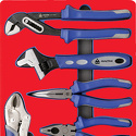 КомплектацияЗахват переставной 250 ммПассатижи тонконосые загнутые 200 ммПассатижи комбинированные 180 ммБокорезы диагональные 160 ммЗажим с фиксатором, круглые губки 175 мм• КлючиРазводной 200 мм, макс. размер 30 мм