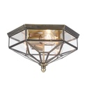 Накладной светильник стиля модерн для улицы имеет размеры 352х304х192 мм. Арматура светильника окрашена в бронзовый цвет. Лампы в комплекте - отсутствуют. В светильнике применяются лампы накаливания или светодиодная LED-лампа. Цвет плафонов - неокрашенный, с прозрачной, рельефной поверхностью. Материал плафонов - стекло. Класс электробезопасности - I, степень пылевлагозащиты (IP) - 43. Максимальная мощность лампы (Вт) - 60. Светильник размещается на потолоке.