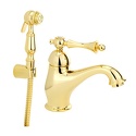 Назначение: универсальный • Конструкция: однорычажный • Монтаж: горизонтальный • Материал: латунь, покрытие - золото • Монтажные отверстия: 1 отверстие • Форма излива: традиционная • Душевая лейка в комплекте: есть • Держатель для душевой лейки: настенный держатель • Донный клапан в комплекте: есть