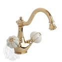 Назначение: для биде • Конструкция: двухрычажный • Монтаж: горизонтальный • Клапан: керамический • Материал: латунь, покрытие - золото • Подводка: гибкая • Монтажные отверстия: 1 отверстие • Форма излива: традиционная • Душевая лейка в комплекте: нет • Аэратор: есть • Донный клапан в комплекте: есть