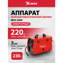 Производитель: Mtx Модель: MIG-220S - ручная дуговая сварка (MMA)/полуавтоматическая сварка (MIG MAG FCAW)/аргонодуговая сварка (TIG) - входное напряжение 180–230 В - диаметр электрода: 5 мм Описание