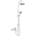Устройство: душевая система • Смеситель: джойстик • Ручной душ (душевая лейка): размер 100 мм, настройки 3 шт • Верхний душ (тропический): размер 200 мм • Комплектация: ручной душ, верхний душ, смеситель, стойка, шланг, крепление ручного душа