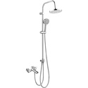 Устройство: душевая система • Смеситель: джойстик • Ручной душ (душевая лейка): размер 100 мм, настройки 3 шт • Верхний душ (тропический): размер 200 мм, настройки 2 шт • Комплектация: ручной душ, верхний душ, смеситель, стойка, шланг, крепление ручного душа