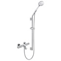 Устройство: душевой гарнитур • Смеситель: термостатический • Ручной душ (душевая лейка): размер 120 мм, настройки 3 шт • Комплектация: ручной душ, смеситель, стойка, шланг, крепление ручного душа