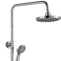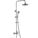 Устройство: душевая система • Смеситель: джойстик • Ручной душ (душевая лейка): размер 87 мм, настройки 3 шт • Верхний душ (тропический): размер 195 мм, настройки 1 шт • Комплектация: ручной душ, верхний душ, смеситель, стойка, шланг, крепление ручного душа, мыльница