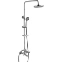 Устройство: душевая система • Смеситель: двухвентильный • Ручной душ (душевая лейка): размер 85 мм, настройки 5 шт • Верхний душ (тропический): размер 200 мм, настройки 1 шт • Комплектация: ручной душ, верхний душ, смеситель, стойка, шланг, крепление ручного душа, мыльница