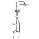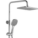 Устройство: душевая система • Смеситель: джойстик • Ручной душ (душевая лейка): размер 117 мм, настройки 3 шт • Верхний душ (тропический): размер 290 мм, настройки 1 шт • Комплектация: ручной душ, верхний душ, смеситель, стойка, шланг, крепление ручного душа, полка