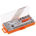 Комплектация- длинногубцы- отвертка- переходник- удлинитель- две часовые отвертки- торцевые головки 8, 9, 10, 11, 12, 13, 14 мм- биты PH 1, PH 2, PZ 1, PZ 2, SL 5, SL 6, T 10, T 15, T 20