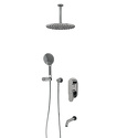 Термостатический картридж Vernet (Франция). Обратный клапан Neoperl. Переключатель на 3 выхода. Душевая насадка Ø 400 мм, 248 форсунок, нержавеющая сталь. Лейка 3-функциональная с системой защиты от известковых отложений. Комплект скрытого монтажа. Наружная часть смесителя.