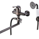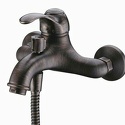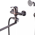 Назначение: ванна+душ • Конструкция: однорычажный • Монтаж: вертикальный • Клапан: керамический • Материал: латунь, покрытие - бронза • Подводка: жесткая • Монтажные отверстия: 2 отверстия • Форма излива: традиционная • Душевая лейка в комплекте: есть • Держатель для душевой лейки: настенный держатель • Аэратор: есть
