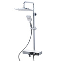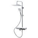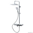 Устройство: душевая система • Смеситель: термостатический • Ручной душ (душевая лейка): размер 86 мм, настройки 3 шт • Верхний душ (тропический): размер 280 мм, настройки 1 шт • Комплектация: ручной душ, верхний душ, смеситель, стойка, шланг, крепление ручного душа, полка