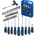 Комплектация- битодержатель,- биты 27 шт: HEX 1.5, HEX 2, HEX 2.5, HEX 3, HEX 4, HEX 5, HEX 5.5, HEX 6, PH 000, PH 1, PH 2, PH 3, PZ 0, PZ 1, PZ 2, PZ 3, SL 3.0, SL 4.0, SL 5.0, SL 6.0, SL 7.0, T10, T15, T20, T25, T30- отвертка универсальная,- отвертки 9 шт: PH0x75 мм, PH1x75 мм, PH2x100 мм, PH2x38 мм, SL3.0х75 мм, SL5.0x75 мм, SL6.0x38 мм, SL8.0x150 мм- переходник HEX 1/4"-SQ 1/4",- торцовые головки 9 шт: 10 мм, 11 мм, 12 мм, 13 мм, 5 мм, 6 мм, 7 мм, 8 мм, 9 мм